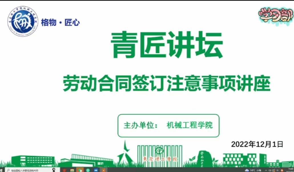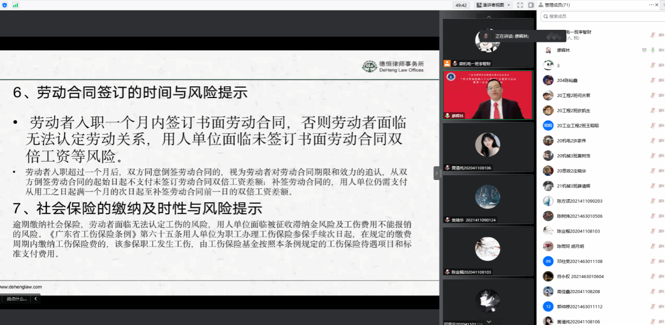 2022年12月1日,太阳成集团tyc9728举办“机械青匠劳动法律法规”活动。活动邀请了来自北京德恒(东莞)律师事务所的廖辉林律师、张艳媚律师,公司黄楚刁老师、胡娜玲老师出席活动。同时共有60名太阳成集团tyc9728的同学同步在线参与活动。