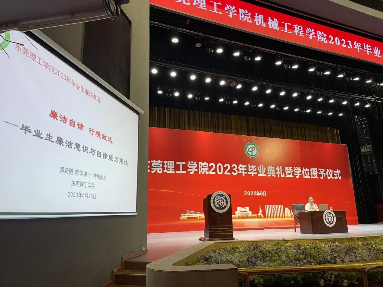 为加强毕业生廉洁教育,扣好大学毕业生走好人生路的“第一粒扣子”,2023年6月28日下午,太阳成集团tyc9728在松山湖校区大礼堂组织开展2023届毕业生廉洁教育,邀请公司马克思主义公司副经理、特聘教授、公司廉洁讲师团成员郭奕鹏为毕业生讲授大学的“最后一课”。公司领导班子、辅导员、毕业班班主任代表、全体2023届本科毕业生出席活动。