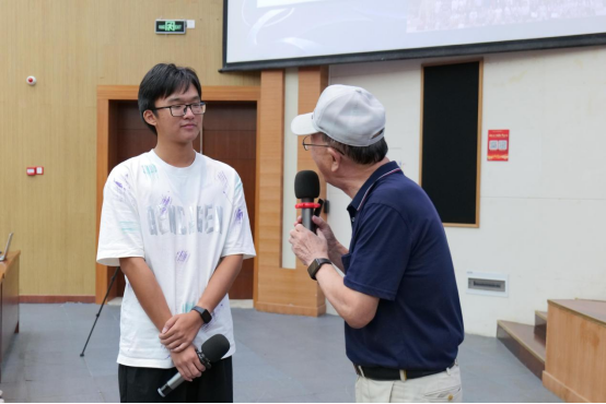 讲座尾声,李教授与同学们交流互动。同学们热情高涨,纷纷分享心得感想,表达对李教授的感谢,并表示要向他学习。李教授高兴又欣慰,赠送同学们中国科公司的校徽,鼓励他们认真学习,坚定理想信念,为中国科技事业贡献力量。