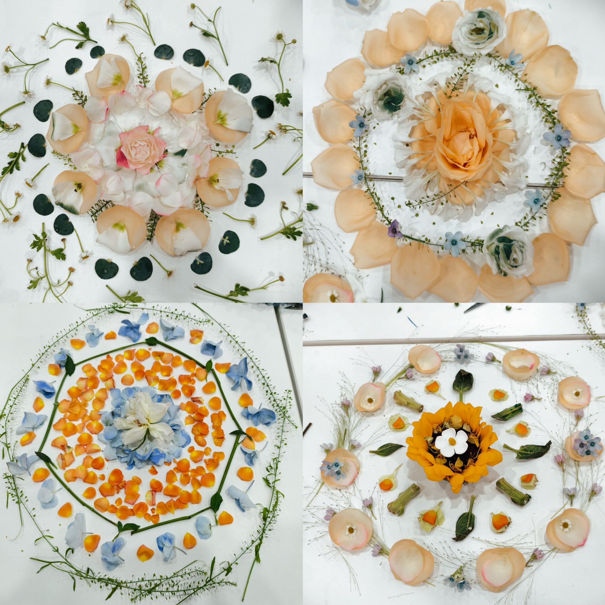 曼陀罗(Mandala)源自梵语,意为“圆圈”,在心理学中被视为潜意识的投射工具。本次活动突破传统纸面绘画形式,同学们以桌面为“画布”,使用花瓣、树叶等自然材料,以个人创作与小组协同配合的模式完成曼陀罗图案。从中心对称的几何线条到自由填色的创意区块,同学们在老师的引导下,将情绪转化为色彩与纹理,体验专注创作带来的心灵平静。