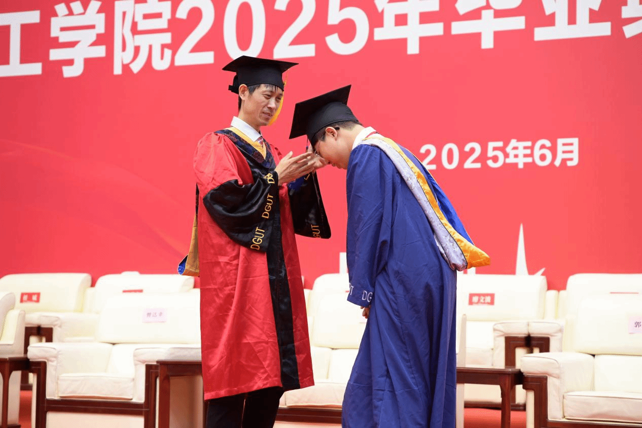 毕业生们身着学士服,缓步上前,颔首等待曾达幸副经理扶正流苏。曾达幸副经理捻起学位帽右侧的流苏穗带,由右及左,拨穗正冠。这一拨,是宣告毕业生已圆满完成学业,学有所成,知识之麦穗已然饱满成熟。这一正,是期冀毕业生未来立身持正,以在校所获之学识、智慧与品格,为人之表率,担时代之责。