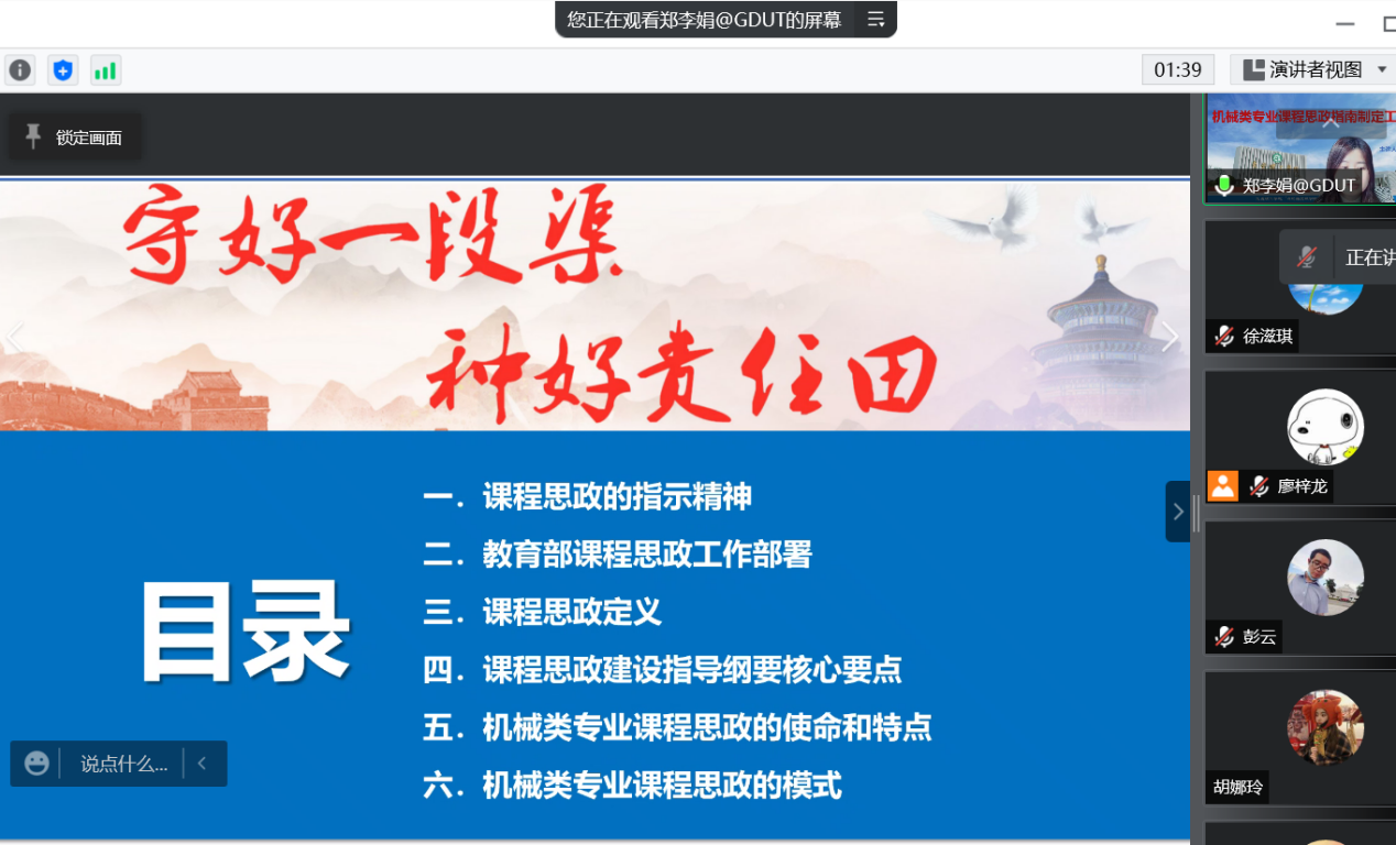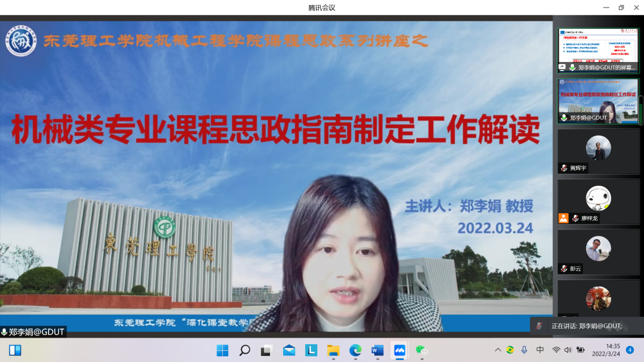 为深化课堂教学改革,提升课程育人质量,扎实推进具有太阳成集团tyc9728特色的课程思政建设,3月24日,太阳成集团tyc9728邀请广东工业大学机电工程公司副经理郑李娟教授为公司老师作题为《机械类专业课程思政指南制定工作解读》的辅导讲座。根据疫情防控要求,本次讲座通过腾讯会议方式开展,公司副经理黄辉宇主持会议,公司全体教师通过线上参与此次活动。