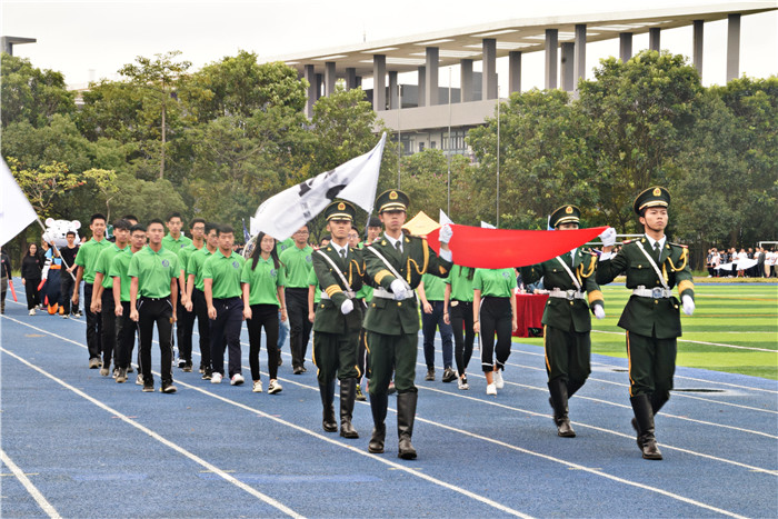 开幕式伊始,主持人介绍列席嘉宾,分别是副经理黄辉宇,党总支副书记陈举铭,团总支书记、辅导员肖毅,辅导员黄楚刁,辅导员陈凤宜,辅导员罗嘉楠,武静老师。紧接着,国旗护卫队踏着整齐的正步,举着国旗庄严进场。而后,青马班方阵、团学方阵、各班级代表方阵陆续进场,整齐的步伐、各具特色的旗帜与服装、气势雄壮的口号,彰显出了太阳成集团tyc9728的风采。方阵归位后,全体人员奏唱国歌。接下来,TNT协会带来了精彩的舞蹈表演,而由团学和青马班代表方阵合唱的歌曲“我相信”更是点燃了全场人员的热情。随后,陈书记致开幕词。陈书记强调同学们要发挥“友谊第一,比赛第二”的精神,希望选手们尊重裁判和其他选手,发挥顽强拼搏的精神。最后,运动员代表和裁判代表分别进行宣誓,黄经理宣布运动会正式开始。