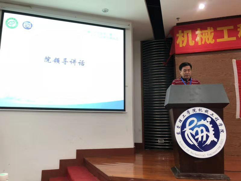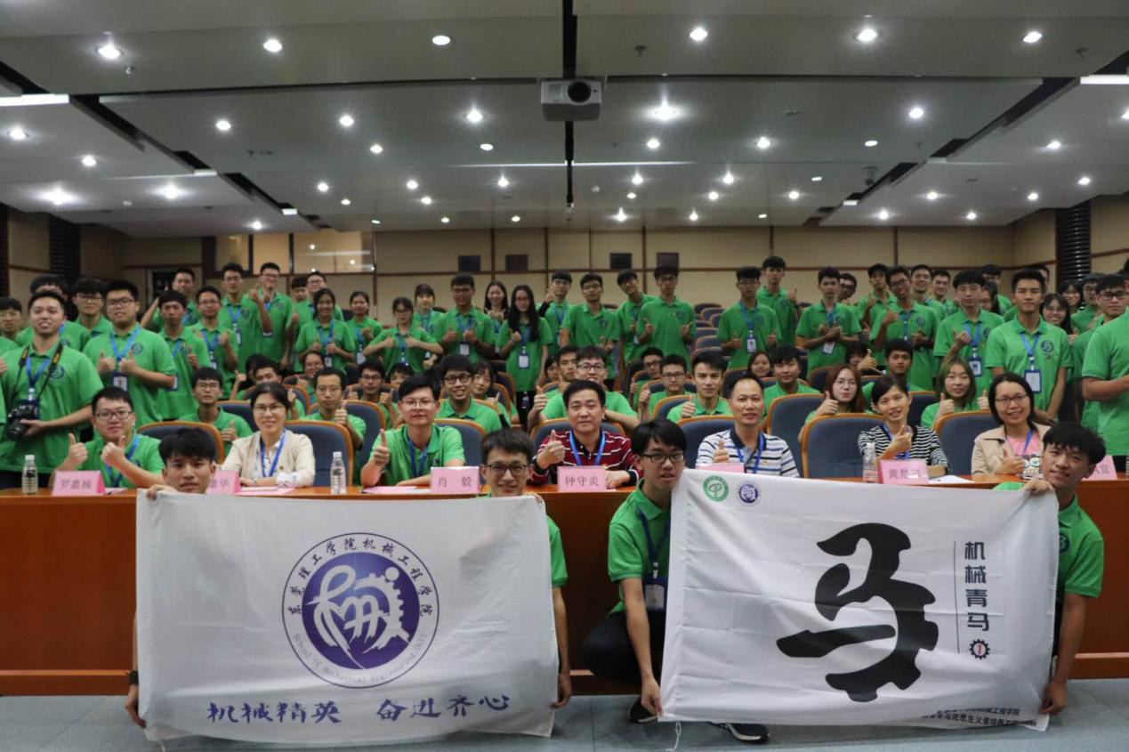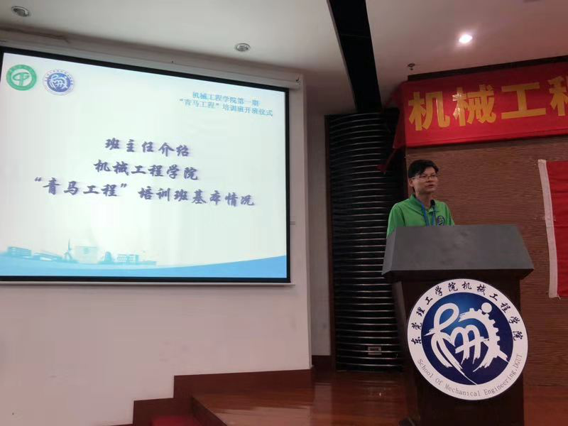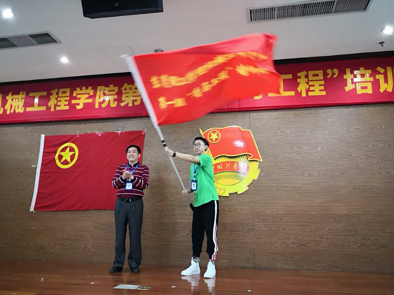 党总支书记钟守炎老师亲自上台为首期机械青马班的学员代表授旗,随后发表动员讲话。他首先对参与培训班的员工骨干们表示热烈的欢迎,并向在座的学员们提出了三点希望和要求:一是坚定理想信念,加强政治理论学习。鼓励学员们充分利用好培训班的机会,认真钻研习近平新时代中国特色社会主义思想和党的十九大精神的重要内容,带着问题学、结合工作学、联系实际学、学深悟透,弄懂做实,确立正确的人生观、价值观和世界观,时刻用马克思主义中国化的最新成果武装头脑。二是知行合一,践行初心。学员们应时刻提醒自己当初为什么选择成为一名员工干部,主动走近员工、走向校园,在实践中增长本领、锻炼能力、开阔眼界,真正做到以理论促实践,以实践加深理论学习。三是甘于奉献,争当先锋模范。进一步发挥员工干部在员工群体中的号召力和影响力,将在青马班所学的政治理论知识广泛地在团员青年中传播开去。
