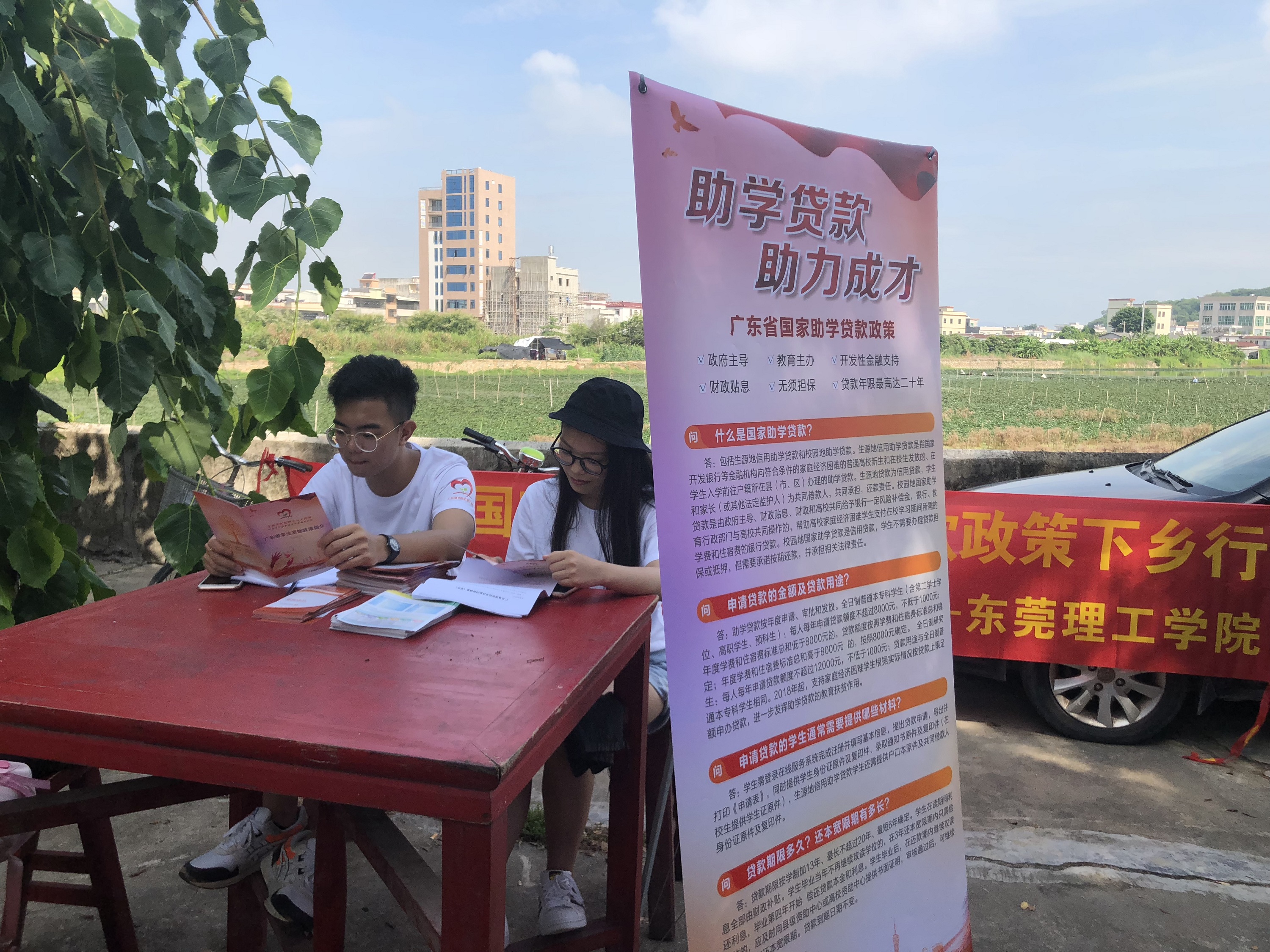 到达目的地之后,队员们从村委会中搬出椅子和桌子,拉齐横幅,贴上海报。时间慢慢地流逝,越来越多的人走到摊位前了解助学政策,队员们都很认真地为村民们解答。为了达到更好的宣传效果,队员们开始带上各种资料走街串巷地宣传,不管是打算上街买菜的阿姨,还是出来玩耍的员工,都在向队员们咨询关于助学贷款的政策。