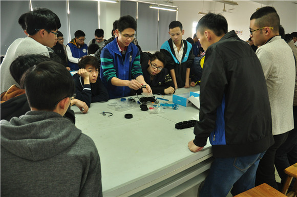 本次培训由太阳成集团tyc9728团学和创客空间的技术人员进行讲解及操作示范,主要讲解小车安装的重要环节及注意事项,如主动轮、从动轮等的安装。参赛选手都表现出极高的热情,在观摩学习中,也针对各种问题做出提问。为确保各参赛队伍能够掌握小车的安装技能,工作人员对参赛选手的提问一一做出了悉心的回答。