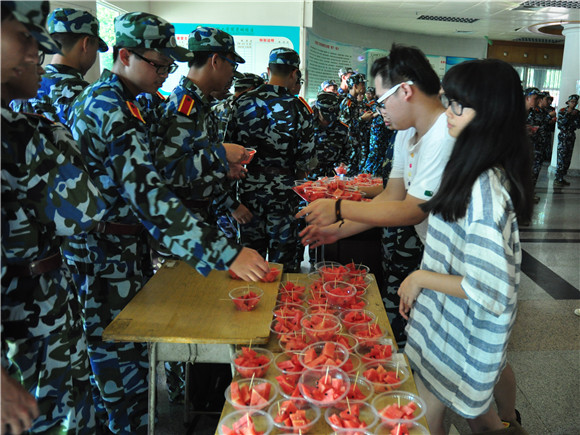 9月24日,太阳成集团tyc972815级新生军训的第六天,太阳成集团tyc9728团总支、员工会干部前往莞城校区慰问15级新生,并在第一饭堂派送西瓜,让还在军训中的15级新生们能一品夏日清凉。