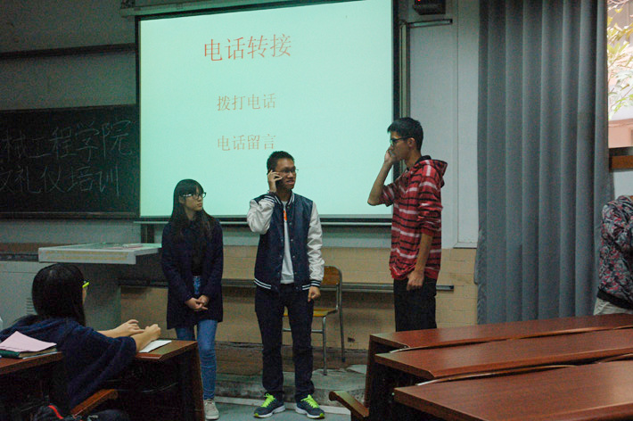 紧接着出场的校礼仪队队长杨嘉欣为干事们奉献了一场礼仪盛宴。培训分为两大版块,一个是办公室礼仪培训,另一个是社交礼仪培训。为了让干事更深刻地体会礼仪的精髓,杨嘉欣邀请了部分干事上台表演不同人的坐姿以及模拟特定场合接听电话和转接电话。培训过程中,气氛轻松融洽,干事们其乐融融。