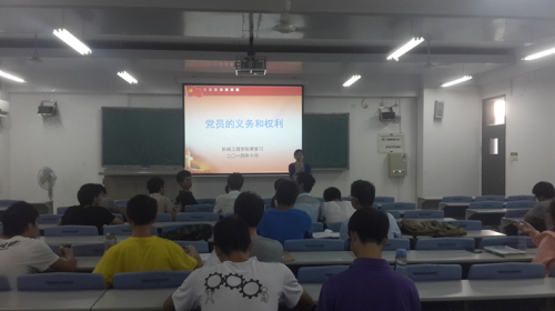 此次党课培训的内容主要包括三点:一、何谓党员义务;二、党员的八项义务;三、党员的八项权利。在培训伊始,黄楚刁老师提问同学们:“何谓党员义务?”这个问题引起了同学们的深思,有的同学还积极发表自己的见解。随后黄楚刁老师为大家讲解了党员的八项义务和八项权利,并且希望同学们自觉履行义务、遵守纪律、杜绝宣扬不好的行为、注意礼节和正确使用权利。在培训的最后,黄楚刁老师通过一个事例来警醒同学们,希望同学们认真对待每次的培训,从而成为一名出色的党员。