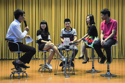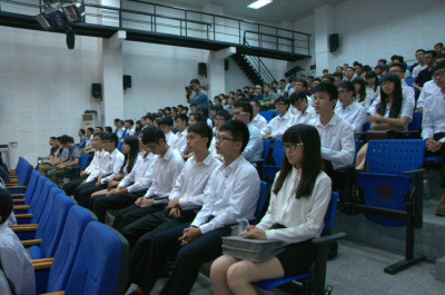 伴随着激昂的团歌合唱,主持人宣布第一次全体大会闭幕。新一届的团学工作就此重新启程,踏上新的征程。在休息15分钟后,钟楚君、谢雪龄、吴志全、曾坚津四位往届主席现任员工会主席韩旭为所有干事开展了一个主席沙龙,往届主席为干事回答了有关学习、恋爱、工作上的问题,为干事提供一个方向上的指引。