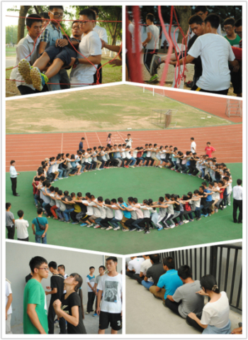当天下午,所有新干事迎来了第一次素质拓展,所有人员被分成8个小组。拓展的第一个活动是团体游戏坐人椅。一次次的失败,一次次的磨合,干事们之间开始找到了默契,可惜的是时间有限,干事们只能带着遗憾结束了这个游戏。接下来是分组游戏,分别是穿越生死网、你写我猜、回形针传递和潮起潮落加七手八脚共四个游戏,规则是两小组进行对决,以流动方式进行。游戏中所有小组各施其技,斗智斗勇。赢者欢喜,输者也未必黯然,干事们在游戏培训官的鞭策下学到的比游戏本身更多。