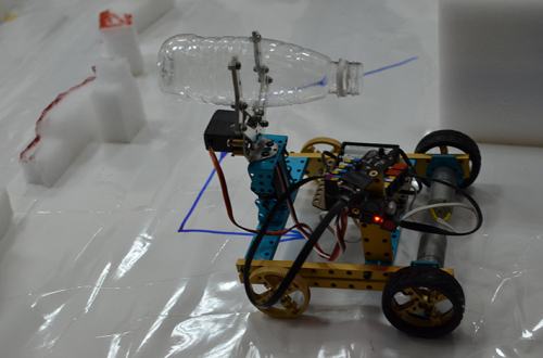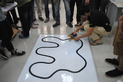 比赛开始后,各个团队便迅速开始行动。因为比赛有机器人组装和编程两部分,因此每个团队都分成了两组,一组负责组装,另一组负责编程。由于经历了第一次比赛对组装部分已经有了较多的经验,因此在本次比赛中进行机器人组装时便显得十分熟练,速度也大大地提高。各团队在组装完机器人之后便将编好的程序输入到机器人中,然后在一个闭合的曲线上行走试验。由于编程控制难度高,几乎每个团队在第一次试验的时候都遇到了问题。但是每个人都会认真地对待每一次所遇到的问题,并认真分析,再不断地修改程序,直至机器人顺利地走完全程。
