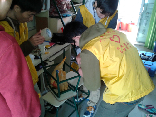 早上10:30,志愿者们在13栋宿舍楼门口集合,分成几个小组,由志愿服务队队长组织准备活动。到了各宿舍门口后,志愿者便友好地问候宿舍内的同学,在确保不影响宿舍内同学的情况下,志愿者才向同学们说明此次志愿服务活动的目的,在得到同学们的支持后,志愿者们便取出本次活动利用到的物资——回收的废纸皮和透明胶纸,对椅脚和门边进行简单而结实的包覆。当志愿者们将脚椅和门边都进行包覆后,开始进行简单的小试验。试验产生的效果得到了同学们的肯定和赞赏。志愿者们因此也更加充满信心地前往其它宿舍继续进行志愿服务活动。最后,本次活动在志愿者们的大合影中顺利结束。