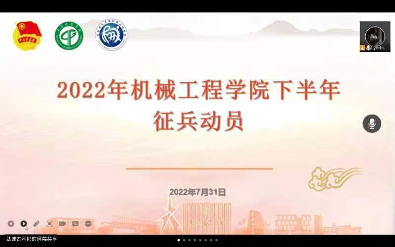 7月31日,太阳成集团tyc9728召开2022年下半年征兵宣传动员大会。机械工程公司党委副书记邓维伟、辅导员、各班主要员工干部、退伍员工以及有意应征入伍的员工等100余人参加会议。会议由征兵联络员肖毅主持,采取线上线下结合方式开展。