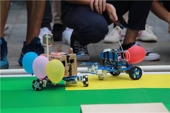 活动开始,主持人宣传开幕,简单介绍前十队伍后,宣布线上大众评比中各队伍的成绩。现场比赛分为创意设计介绍、智能机器人绘图、投球团队赛、巅峰对决赛五大环节。第一个环节由各队伍派代表进行创意拼装讲解、3D打印技术解说并由评委打分。第二个环节队伍现场对小车进行编程并进行绘图,讲解绘图思路,并由评委评分。第三环节为投球团队赛。比赛开始,各小车奋力齐冲,向小球发起了冲锋。比赛十分激烈,小车翻车,受损的情况时有发生。但也有一些小车表现优异,展现出“神操作”将小车送入得分区。根据各队伍之前的分数进行排名,进而进入下一环节嘉年华巅峰对决环节。在巅峰对决环节中,参赛队伍将三个气球以及一根针安装到小车上,每辆小车都向敌方小车的气球上进发。在该环节中,每个队伍的操作手各显神通,给我们带来了精彩的对决。