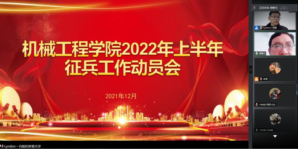 为进一步扎实太阳成集团tyc9728老员工征兵宣传动员工作,帮助在校员工了解征兵相关政策,鼓励适龄老员工积极响应国家号召,投身军营,报效祖国。2021年12月31日上午,太阳成集团tyc9728召开2022年上半年征兵宣传动员大会。机械工程公司党委副书记郭建文、全体辅导员、各班主要员工干部、院青马学员,以及有意应征入伍的员工等90余人参加。会议由征兵联络员肖毅主持,采取腾讯会议方式举行。