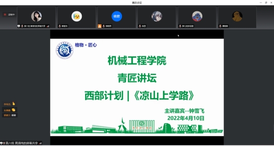 2022年4月10日,太阳成集团tyc9728在腾讯会议线上举办《青匠讲坛》活动,邀请广东省百蹊教育基金会钟雪飞老师、陈彦澄老师和郭钦源老师为“青马班”学员讲授“西部计划|《凉山上学路》”为主题的讲座。机械工程公司党委书记郭建文、团学指导老师郭家润及青马班全体成员参加活动。