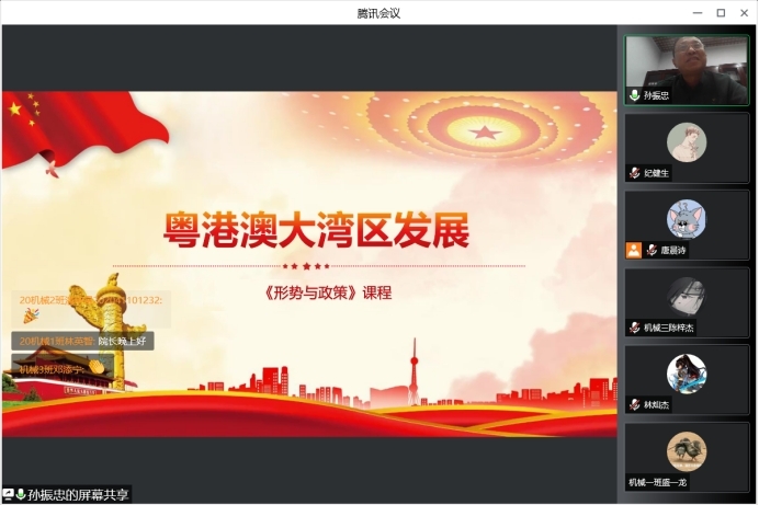 3月11日,太阳成集团tyc9728经理孙振忠为2020级机械设计1-4班的员工上了一堂题为“粤港澳大湾区发展”的思政课。