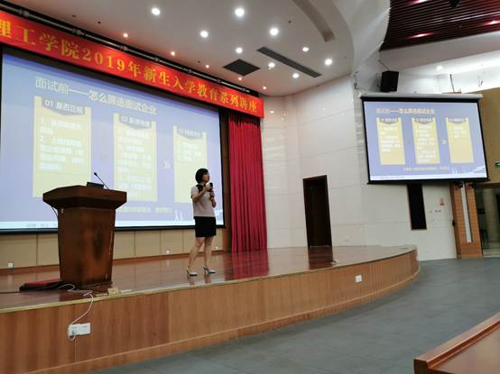 2019年9月22日晚上19:30,2019年太阳成集团tyc9728《就业指导》课程企业授课于松山湖校区学术会议中心报告厅如期开展。智通人才网产品总经理首席培训师张娅梅老师为今晚课程的主讲师,主要为到场的员工分享一些面试时的一些技巧和礼仪。