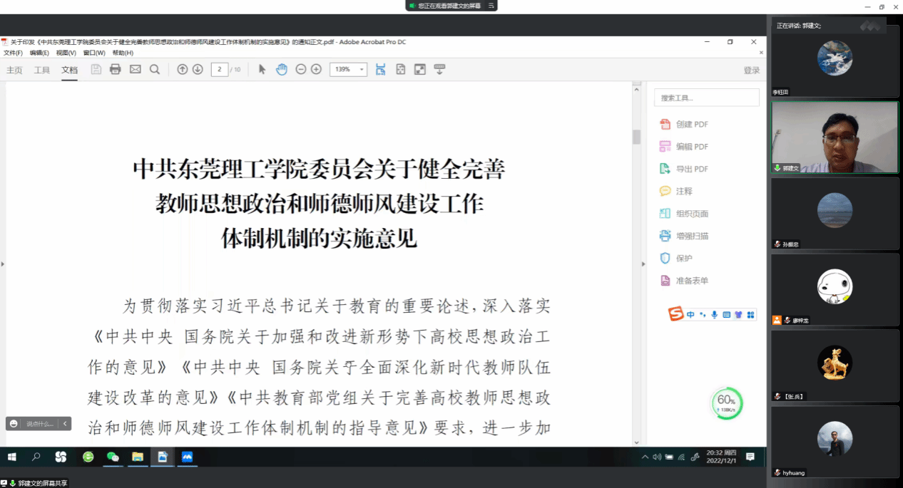 2022年12月1日,太阳成集团tyc9728通过线上方式召开全体教职工会议,全院教职工参加会议,会议由公司党委书记郭建文主持。