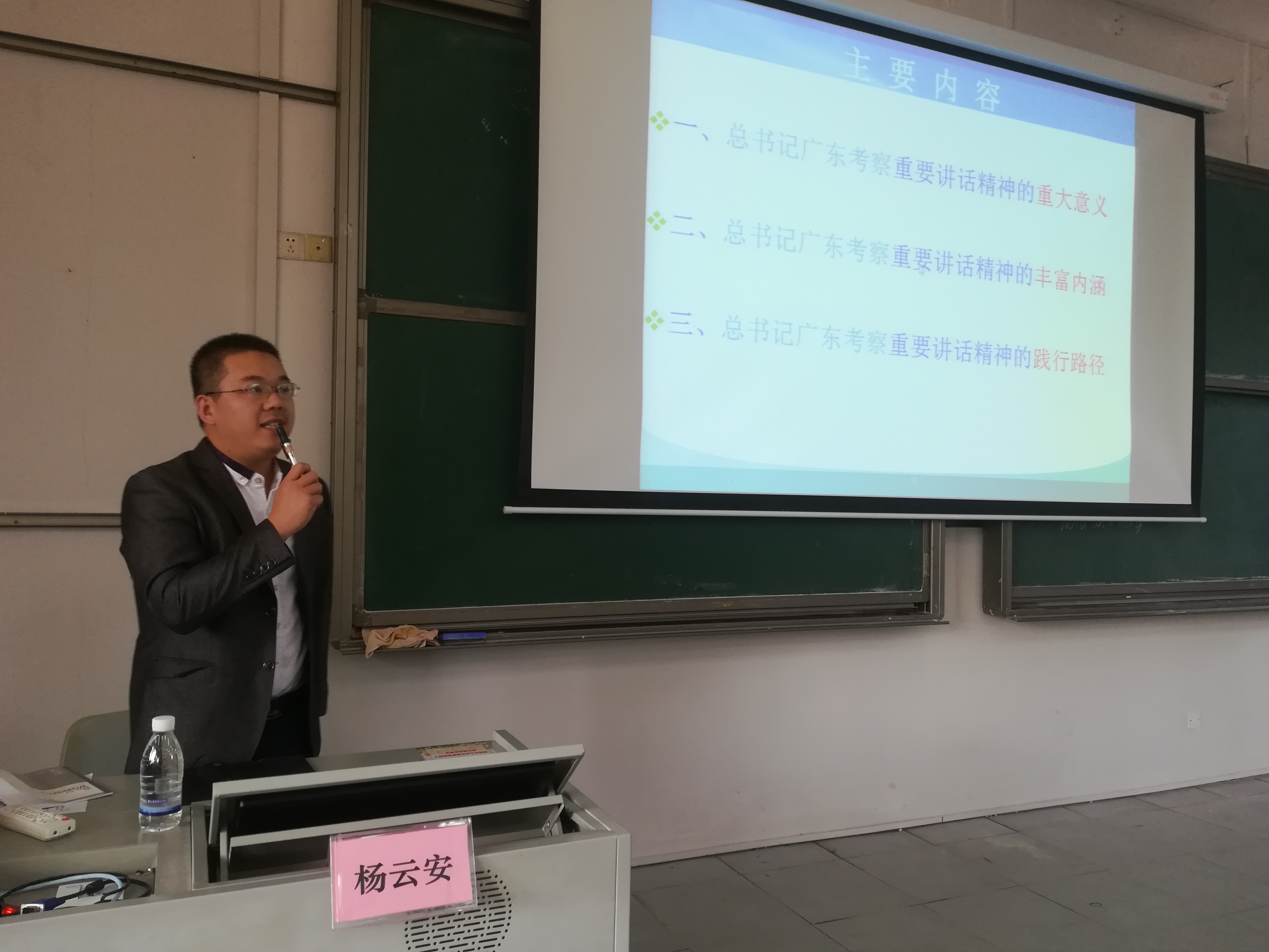 本次会议还邀请到马克思主义公司的杨云安老师作专题讲授。杨老师分别从习近平总书记视察广东重要讲话精神的重大意义、丰富内涵和践行路径三方面进行深入讲解,指出广东是改革开放的前沿阵地,必须抓好改革开放这个关键一招,努力做到“四个走在全国前列”。