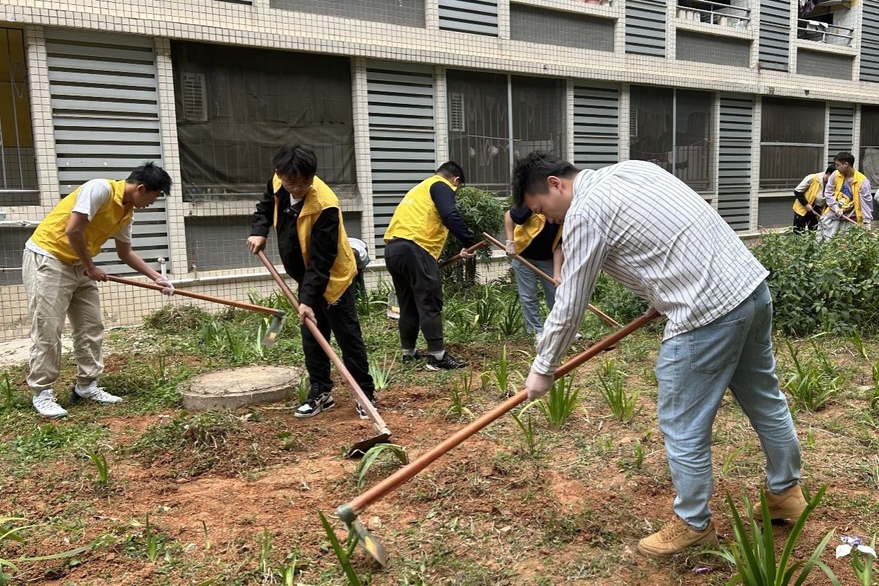 活动现场,青年师生热情高涨,分工明确,配合默契,挥锹铲土,扶苗培土,播撒草籽,为花卉提供优良的生长条件,为同学们营造美化舒适的社区居住环境。