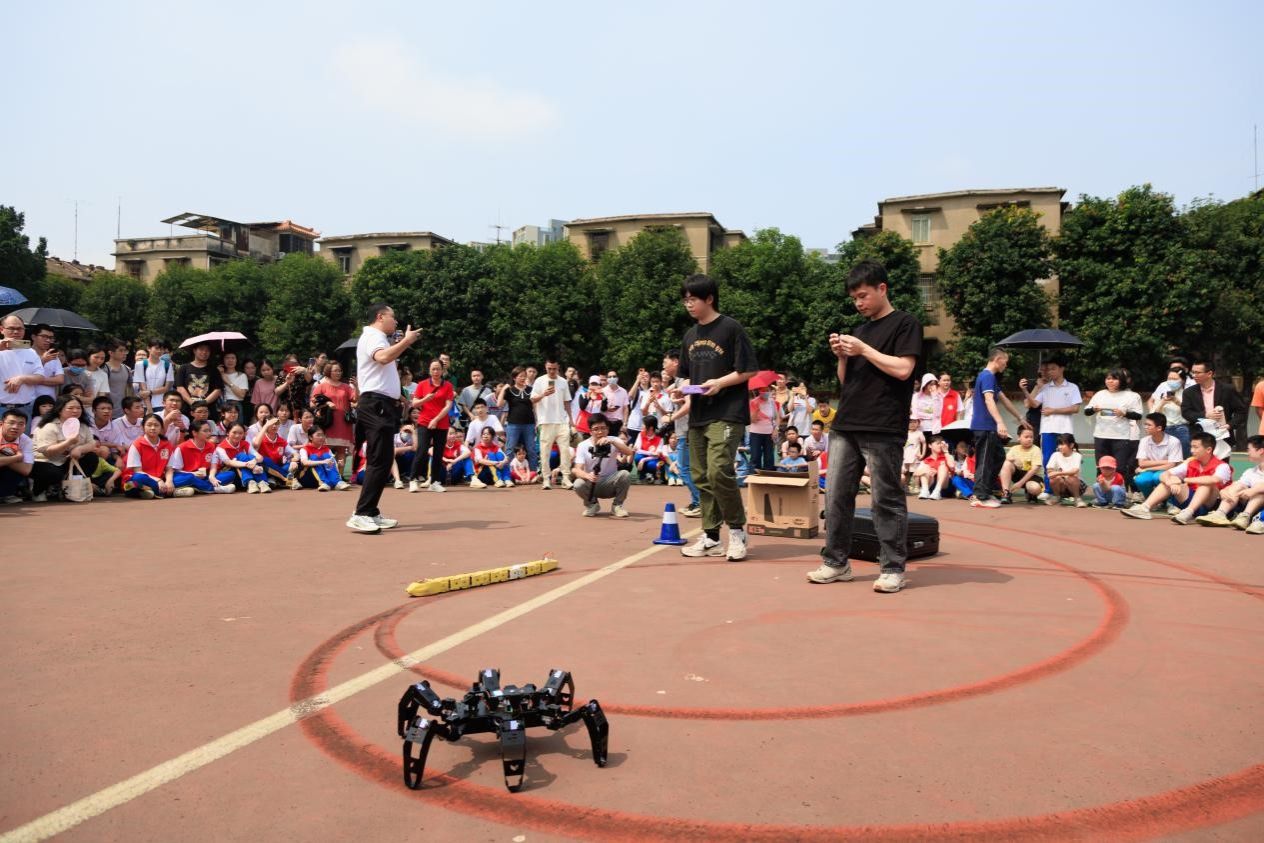 随后,招生宣传小组抵达新会一中,参与了该校的年度科技文化节活动。宋加雷博士带领员工团队,在科技文化节上展示了他们研发的仿生机器人。这些机器人凭借其创新的技术和独特的设计,吸引了众多师生的目光,并引发了热烈的讨论。