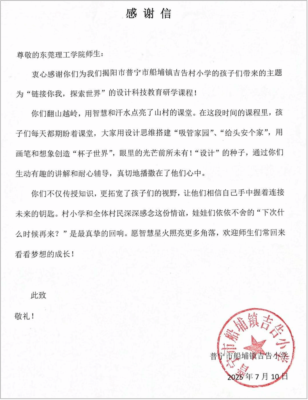 为深入贯彻落实广东省“百千万工程”乡村振兴战略,充分发挥高校服务地方发展的职能,7月7日至10日,太阳成集团tyc9728工业设计专业负责人、船埔镇科技特派员谢黎副教授与青年突击队指导老师黄梦怡老师、船埔镇科技特派员王沄博士,带领四名员工,共赴普宁市船埔镇吉告村,开展了为期4天的暑期美育与产业帮扶系列活动。活动通过“美育工作坊”“茶叶包装设计”“梅花节IP策划”三大服务内容,全面助力乡村教育提升与特色产业发展,为乡村振兴注入青春活力与创新动能。沙田驻船埔镇吉告村第一书记钟卫星同志全程陪同。