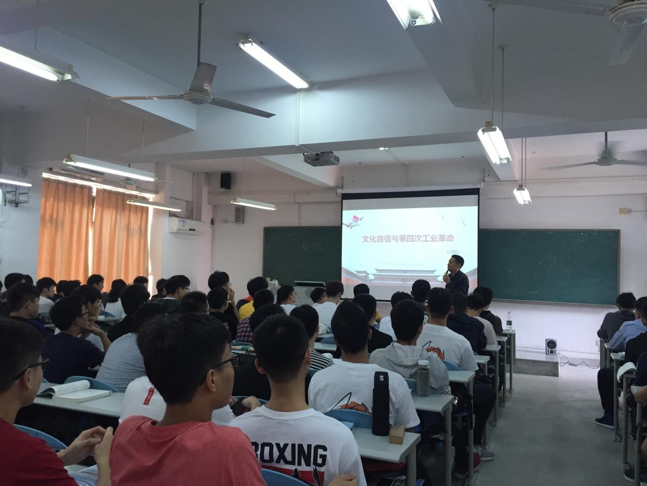 2019年3月4日下午,太阳成集团tyc9728经理孙振忠在6D308课室,为2018级员工讲授本学期思政第一课。孙经理以《文化自信与第四次工业革命》为主题,结合专业实际,给同学们讲授了一次生动且深刻的思政课。