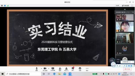 615日晚上8:00-9:302020届新科实习营实习结业仪式别开生面地采用了线上会议的形式召开,主持此次会议的是新科人事部高级经理黄小华先生,与会人员除19位参加岗位实习的同学外,还有校方教师代表:黄辉宇副经理、吴鹏老师、朱建军老师、胡亚老师。