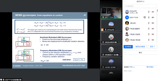 Alberto Corigliano教授介绍了最近在创新微机电系统领域的相关研究活动,包括国际研究进展及研究方向的最新动态,分享了关于调频陀螺仪的前沿研究,以及微机电系统中的辅助超材料,制造单轴和多轴加速度计的增材制造和湿法金属化等。教授还鼓励师生结合现有的技术条件,结合交叉学科的需求,开展一些研究尝试。参加师生也通过会议平台信息窗口与Alberto Corigliano教授进行了专业问题的讨论。