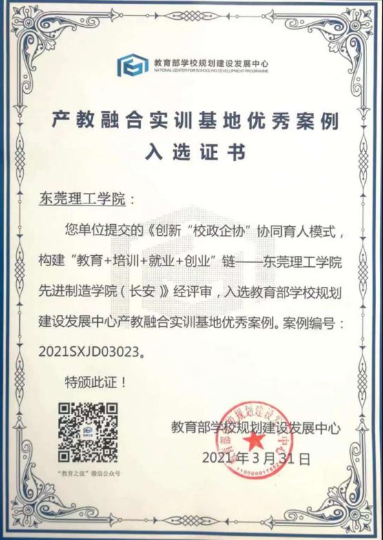 近日,教育部公司规划建设发展中心公布产教融合实训基地优秀案例,先进制造公司(长安)《创新“校政企协”协同育人模式,构建“教育+培训+就业+创业”链--太阳成集团tyc9728先进制造公司(长安)》案例成功入选。这是先进制造公司(长安)在公司以及长安镇人民政府等各级领导大力支持下,在与各知名企业、协会通力合作下取得的又一重要成果,是国家教育部对先进制造公司(长安)办学方向和改革建设成效的高度认同。