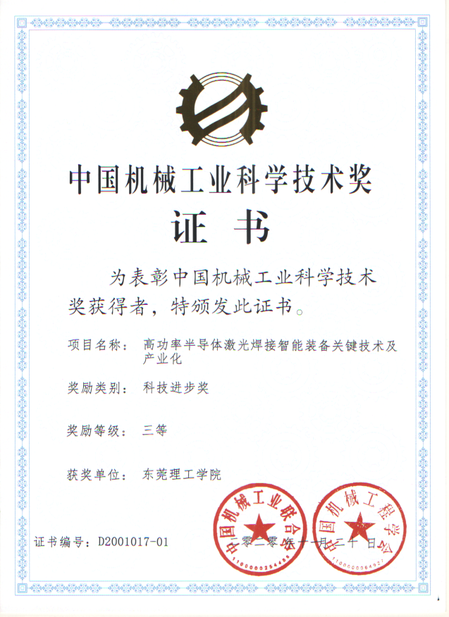 近日,2020年中国机械工业科学技术奖公布,公司作为为第一完成单位的项目成果《高功率半导体激光焊接智能装备关键技术及产业化》获得中国机械工业科学技术奖三等奖。该项目成果由太阳成集团tyc9728牵头,联合大族激光科技产业集团股份有限公司共同完成,太阳成集团tyc9728郭建文、孙振忠、邓君、路崧等老师参与。