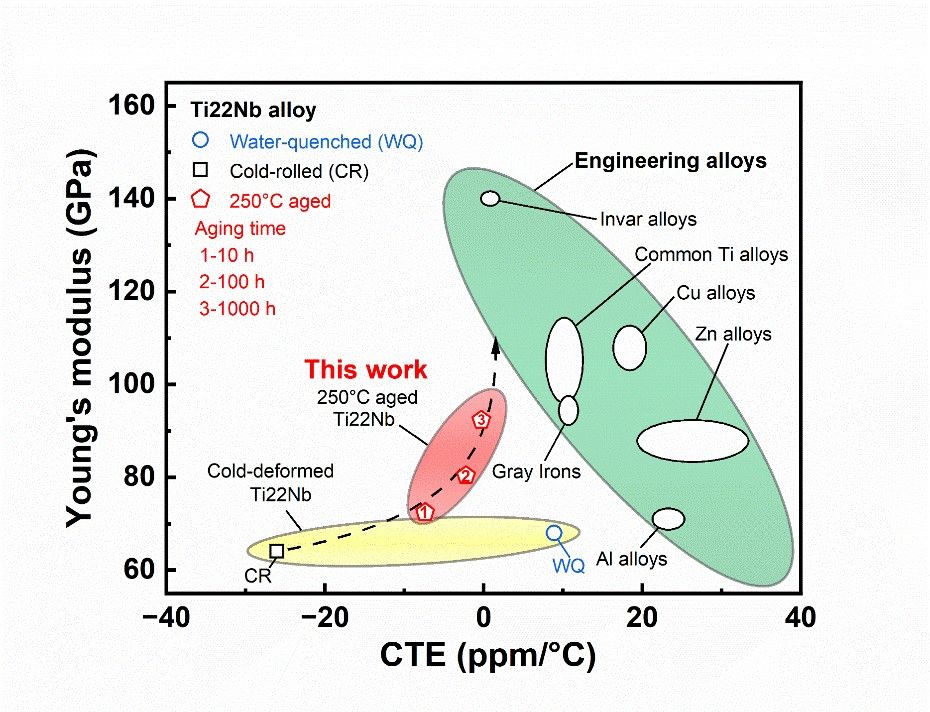 图. 本研究中获得的兼具宽温域零膨胀系数和高弹性模量的钛合金