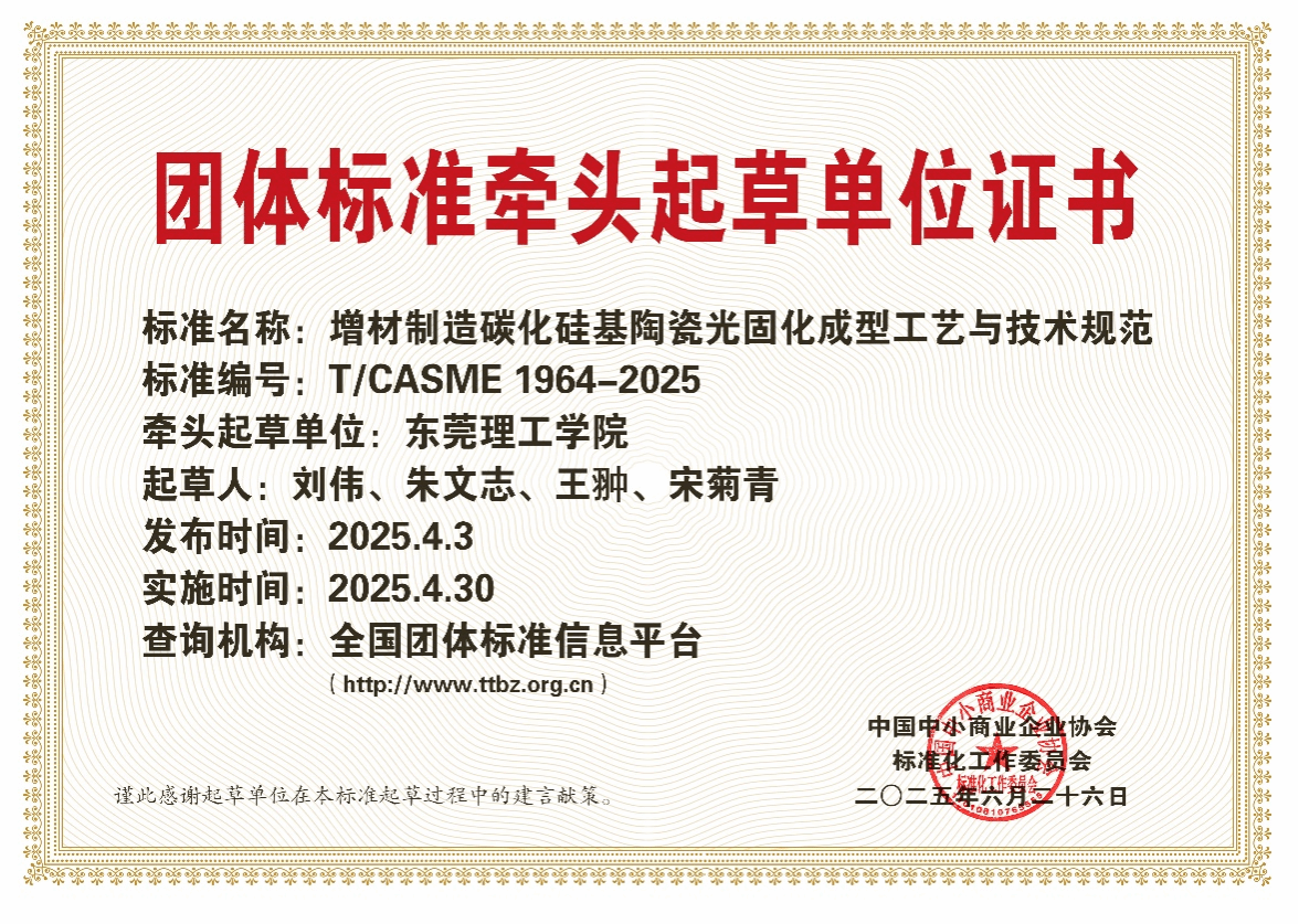 近日,太阳成集团tyc9728增材制造研究所刘伟教授牵头制定的《增材制造碳化硅基陶瓷光固化成型工艺与技术规范》团体标准(标准编号:T/CASME 1964-2025)成功通过评审,可在全国团体标准信息平台检索,该标准于 2025 年 4 月 3 日发布,4 月 30 日实施。