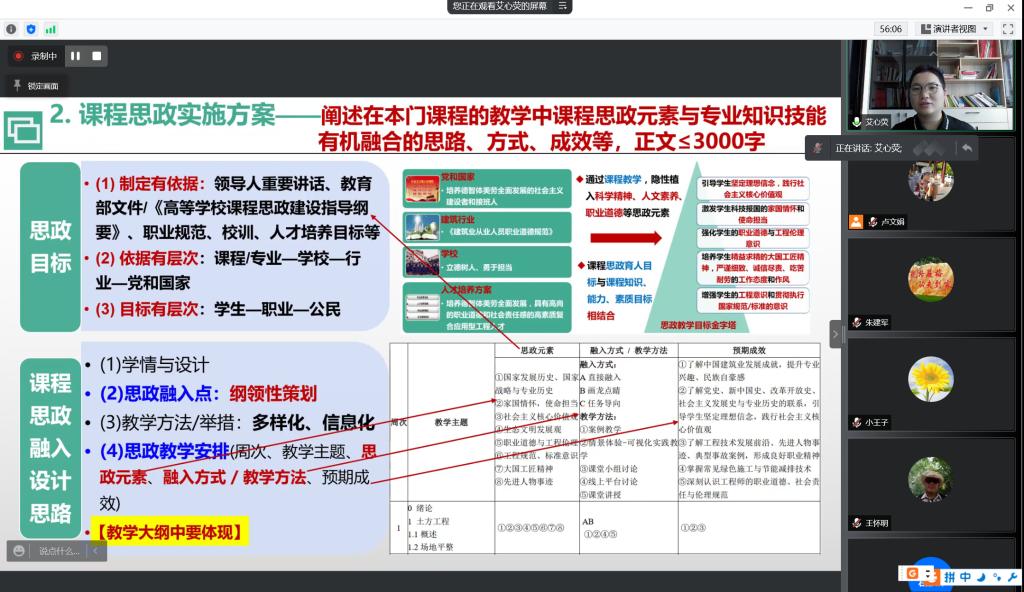 为推动“深化课堂教学改革 提升课程育人质量”公司产品大讨论,发挥典型在提高人才培养能力中的示范引领作用,支部邀请广东省首届本科高校课程思政教学大赛一等奖获得者——环建公司土木工程系主任艾心荧副教授做了题目为《“用心、用情、用智、用力”—课程思政教学大赛经验分享与交流》的专题报告。报告中,艾老师就大赛的经验与过程与各位老师进行了分享:从课程思政教学比赛赛制、课程思政实施方案、课堂教学设计、课程教学大纲、说课、课堂教学以及现场答辩等7个方面进行详细介绍。