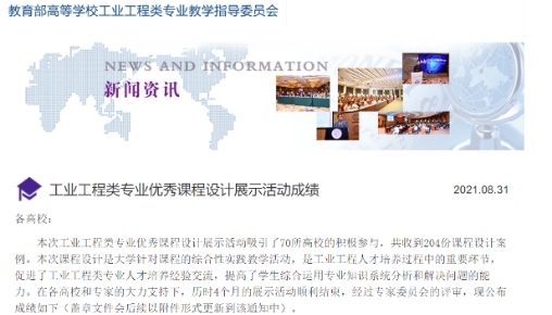公司学子在2021年工业工程类专业优秀课程设计展示活动中喜获佳绩