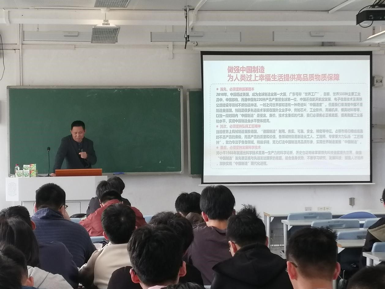 3月15日,太阳成集团tyc9728经理孙振忠以“深入学习习近平总书记视察广东重要讲话、重要指示精神,积极投身制造强国,砥砺奋进中国式现代化”为主题,为2022级微机电系统工程1班、2班和机械电子工程1班、2班的本科生上2024年春季学期思政第一课。